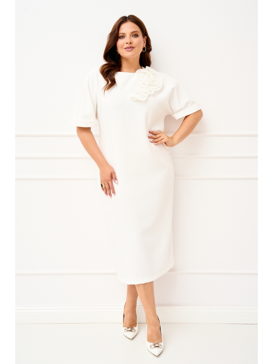 Женское платье полуприлегающего силуэта выполнено из плательной ткани со втачными рукавами и декоративным несъемным цветком; по спинке вырез в виде "капельки", который застегивается на петлю и пуговицу; по низу - шлица.