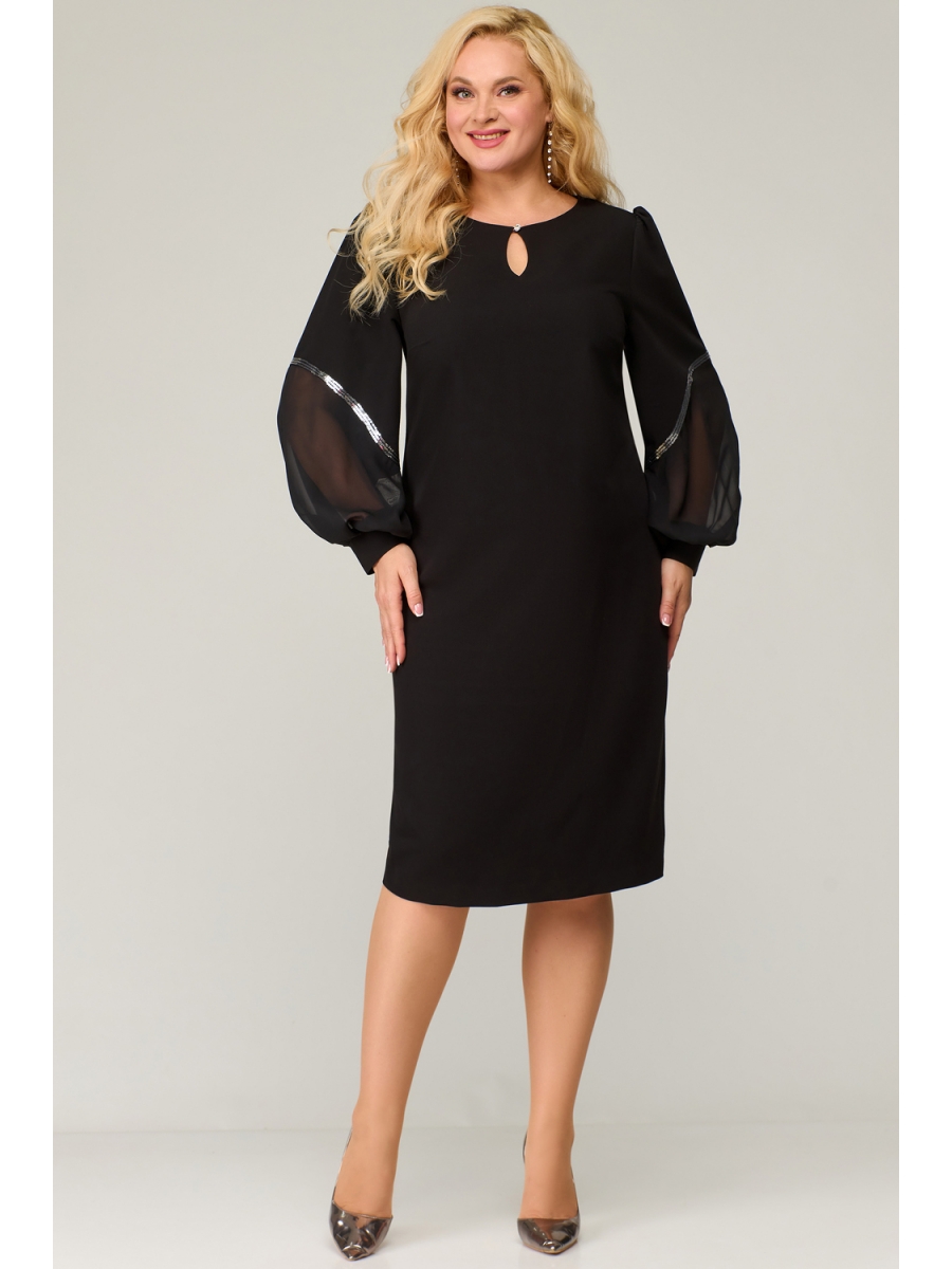 Платье женское полуприлегающего силуэта, слегка зауженное к низу с втачным рукавом. Горловина округлой формы с застежкой капелькой по переду. По линии груди переда вытачки. Спинка со средним швом и разрезом по низу. Рукав объемной формы состоит из двух деталей и декорирован тесьмой из пайеток. В верхней части рукава сборка. Нижний срез рукава присборен и обработан притачной манжетой с застежкой на петлю и пуговицу.