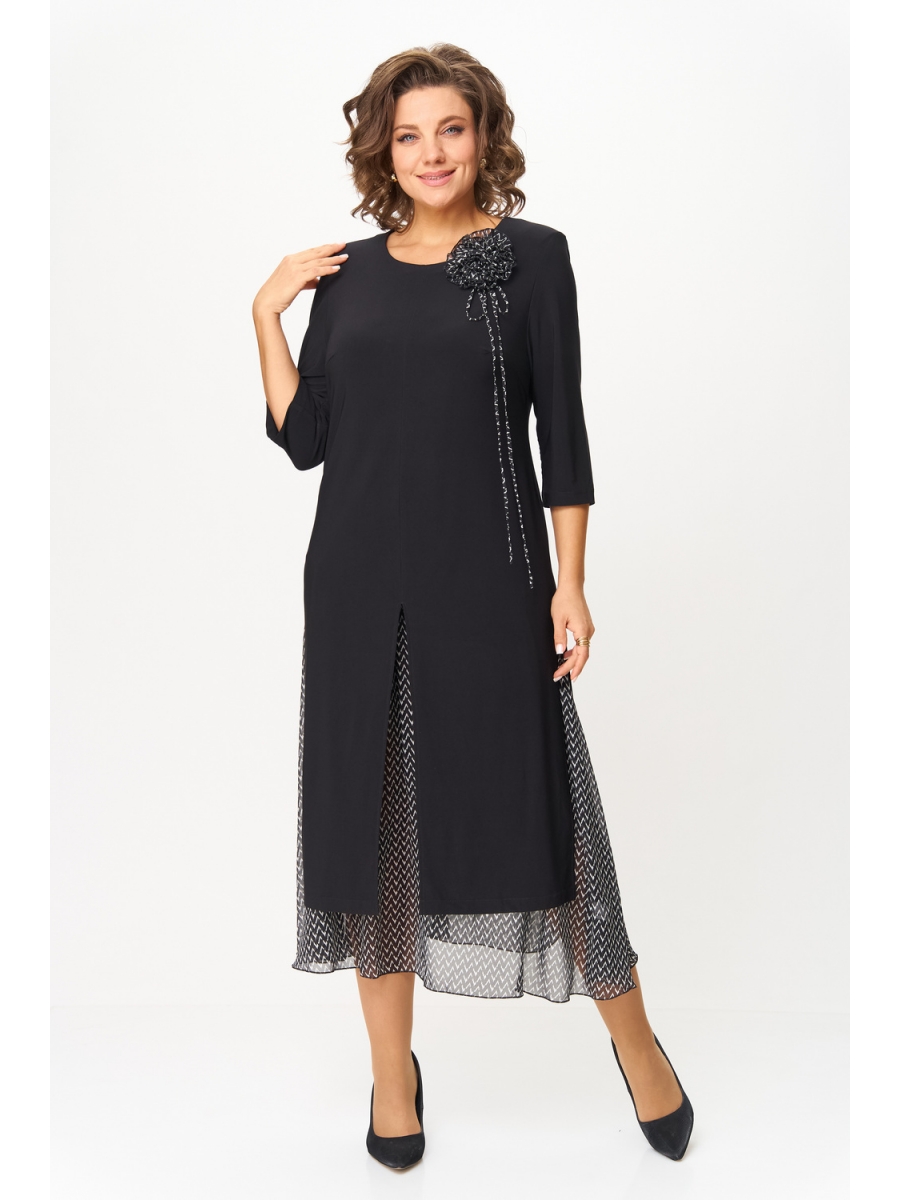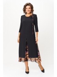 Платье женское полуприлегающего силуэта расширенное к низу, выполнено в комплектации из двух предметов. Верхнее платье – из мягкого эластичного материала, с высокими разрезами по переду, спинке и бокам, с втачным рукавом ¾. По линии груди вытачки. По левой части переда съемный цветок.