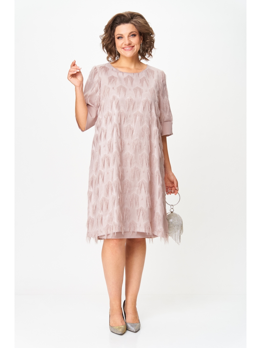 Это платье создано для особых случаев, когда нужно выглядеть безупречно. Снизу — лаконичное платье-чехол из гладкого текстиля, красиво подчёркивающее фигуру, сверху — лёгкий полупрозрачный слой с фактурным узором «реснички» и деликатным мерцанием. Такой тандем создаёт эффект глубины и воздушности, образ выглядит нарядно и дорого. Свободный верх дарит комфорт и мягко скрывает всё лишнее, а длина миди делает силуэт элегантным и женственным. Универсальный оттенок легко сочетается с обувью и аксессуарами.
