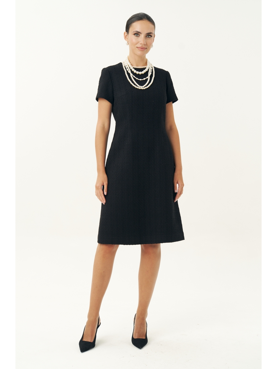 Неизменно, черное маленькое платье остается образцом элегантности… Платье женское, выполнено из костюмной твидовой ткани, полуприлегающего силуэта, расширенное к низу, на трикотажной подкладке притачной по низу переда и спинке, по низам рукавов. Платье повседневное. Перед с талиевыми вытачками, с нагрудными вытачками, идущими от боковых швов. Спинка с талиевыми вытачками, со средним швом, в верхней части которого обработана застежка на потайную тесьму-молнию. Рукава втачные, одношовные, короткие. Горловина переда и спинки обтачная, округлая.