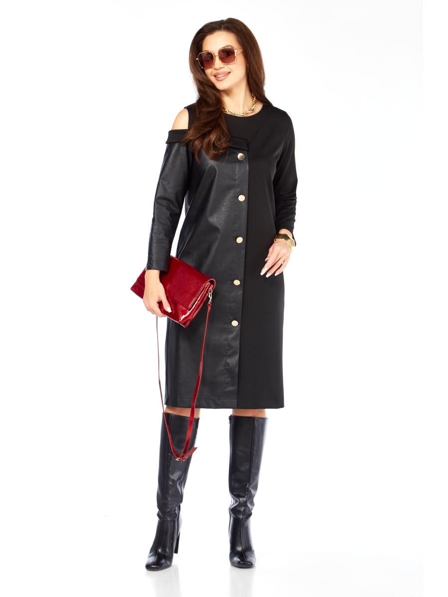 Стильное, шикарное женское платье из трикотажной ткани и кожи. Платье полуприлегающего силуэта, интересного сложного дизайна, по переду и спинке наполовину с трикотажной ткани и кожей, по переду качественная фурнитура, т.е. пуговицы металл под золото. Платье может подойти на все случаи жизни. Сзади потайная молния, по низу разрез.