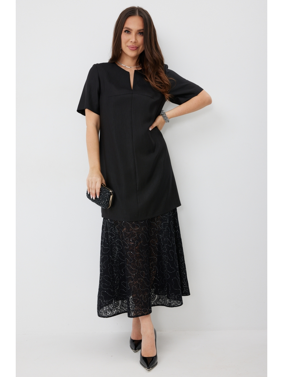 Элегантное платье свободного силуэта. Платье представлено, как нижнее платье из нежной подкладочной ткани, дополненной по низу притачным воланом из красивого кружева с пайетками, и верхнего короткого платья-туники из гладкой костюмной ткани. Застежка по спинке на потайную молнию.