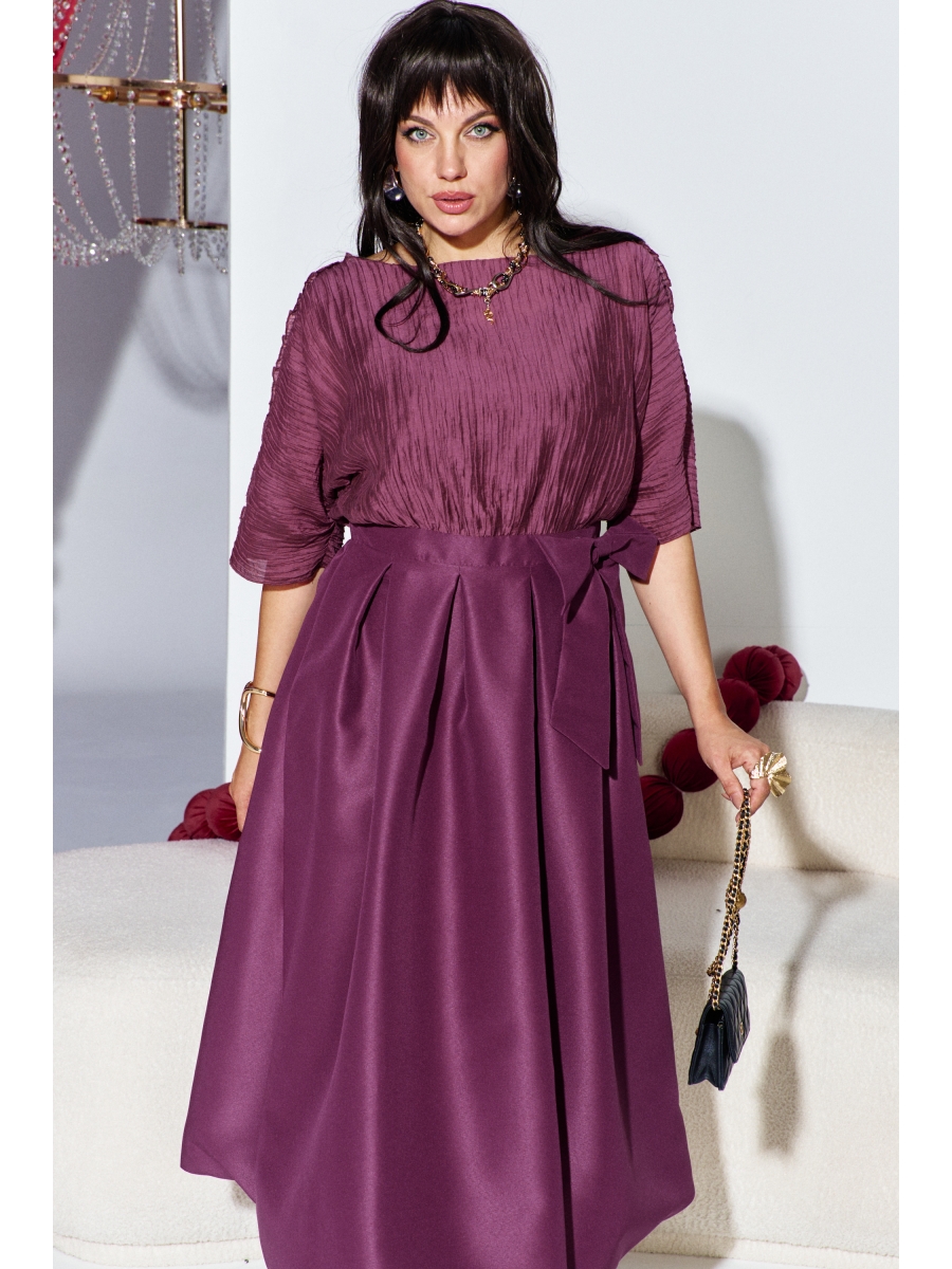 Невероятно красивое и элегантное платье отвечает всем требованиям вечернего наряда! Сочетание тканей разных фактур и дизайнов в одной модели - тренд сезона. Это элегантное платье миди состоит из двух частей, создающих впечатление комплекта. Верхняя часть платья выполнена из плиссированной ткани, что придаёт ему текстурный и динамичный вид, а юбка с атласным блеском придаёт изделию нарядность, гармонично дополняющего верх. Высокая талия юбки визуально удлиняет фигуру. Общий ансамбль выглядит изысканно и подходит как для повседневных, так и для более официальных мероприятий. Сочетание различных фактур и оттенков винного создаёт глубокий и сложный образ. Дополнительные детали, такие как золотые украшения и туфли с шипами, придают платью особый шарм. Платье приталенного силуэта, с округлой формой горловины, рукав цельнокроенный, длинной ¾. В плечевом шве платья декоративная вставка рюши. Лиф платья на подкладке. Пояс в платье притачной со вставкой резинки по спинке, с застроченными складками от пояса по юбке платья. Юбка в платье «балон», на подкладке.
