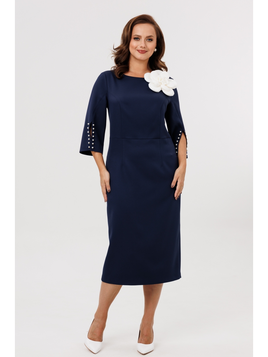Оформить заказ →Нарядное женское платье полуприлегающего силуэта, отрезное по линии талии. Выполнено из плательной ткани (чуть тянется). Рукав втачной ¾ с разрезом и декоративными бусинами (жемчуг) по низу рукава. Спинка с застежкой на потайную тесьму-молнию (длина 50 см). По низу платья шлица. Декоративным элементом в платье является съемный цветок. Платье без подкладки.