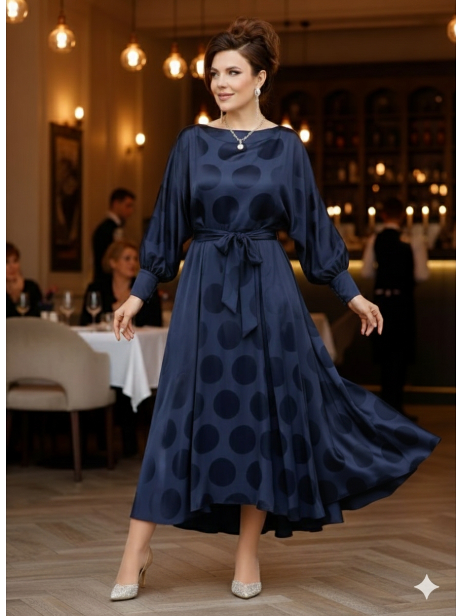 Элегантное вечернее платье-миди выполнено из благородного шелковистого материала насыщенного темно-синего оттенка. Платье отрезное по талии, с широкими рукавами-баллон на высоких манжетах, что придает силуэту воздушность и драматичность. Главным декоративным элементом является глянцевый принт в крупный горох, создающий эффектный визуальный объем и фактуру. Вырез-лодочка акцентирует линию ключиц, а талия подчеркнута изящным съемным поясом из основной ткани, позволяющим регулировать посадку. Подол платья имеет асимметричную длину (хай-лоу), которая мягко струится и красиво развивается при движении, открывая щиколотки и демонстрируя обувь. Материал платья обладает роскошным атласным блеском, который великолепно отражает свет, подчеркивая глубину цвета и богатство изделия. Этот фасон идеально подходит для создания праздничного, торжественного образа, маскируя недостатки и подчеркивая достоинства фигуры. В боковом шве платья застёжка на потайную тесьму-молнию.