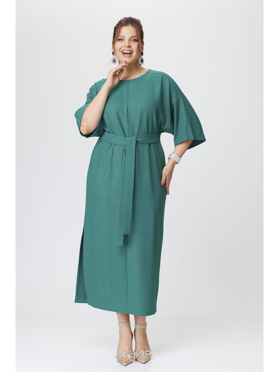 Платье праздничное нарядное женское, для торжественных случаев. Платье прямого силуэта, с круглым вырезом горловины и цельнокроеными рукавами. Перед со средним швом, отрезной деталью рукава. Спинка со средним швом, потайной молнией, кокеткой, переходящей в рукава. В правом боковом шве разрез.
