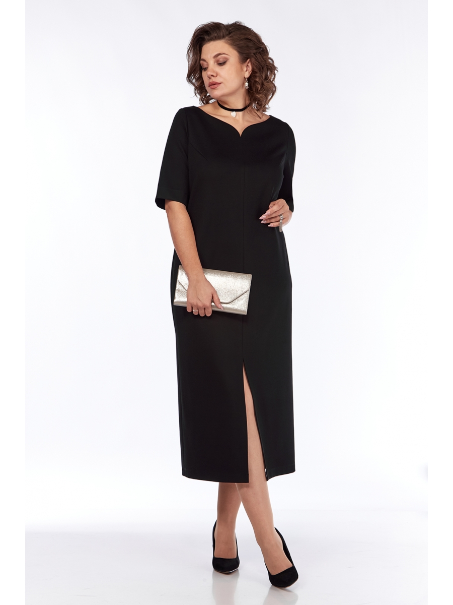 Платье женское, нарядное, полуприлегающего силуэта выполнено из фактурного трикотажного полотна премиум-класса. Горловина фигурной формы. Перед с нагрудными вытачками и средним швом в котором обработан разрез. Спинка со средним швом. Рукава втачные, одношовные с небольшим разрезом по шву.