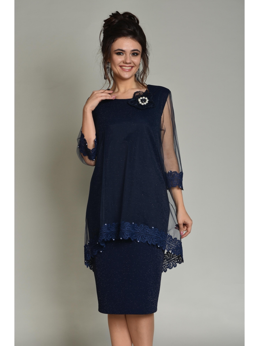 Шикарное платье, которое подойдет для любого предстоящего Вам торжества. Платье состоит из двух слоев, сшитых по пройме рукава и горловине. Нижний слой состоит из фактурного трикотажа с люрексом. Имеются вытачки на груди и сзади на талии. Верхнее платье состоит из сетки, а низ его обработан кружевом. (ПРИМЕЧАНИЕ! Кружево может отличаться от оригинала). Спереди верхнее платье короче, сзади длиннее. Рукав 3/4, манжеты состоят из кружева. Платье без застежки.