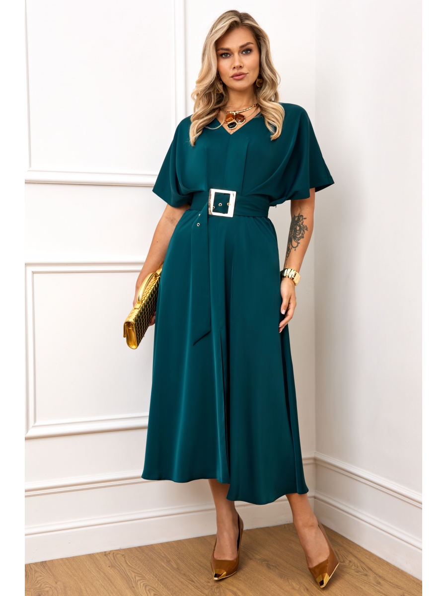 Элегантное нарядное платье, выполнено из роскошной струящейся плательной ткани с добавлением вискозы. Платье с V-образным вырезом горловины, отрезное по линии талии. Верхняя часть платья выполнена в свободном стиле со спущенной линией плеча и глубокими складками на линии талии, что придает платью особый стиль и шарм. Юбка платья с расклишением, по переду с разрезом. В боковом шве платья потайная молния застежка. Рукав цельнокроеный, объёмный, со спущенной линией плеча. В комплекте к платью идет съемный пояс с шикарной золотой пряжкой.