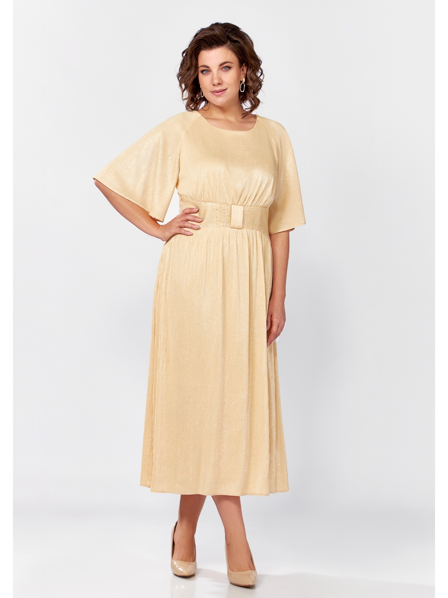 Нарядное женское платье, выполнено из плиссированной ткани, полуприлегающего силуэта. Горловина платья округлой формы, на обтачке, лиф платья отрезной по линии талии с втачным поясом из основной ткани, декорирован стразами. Юбка платья А-образного силуэта, спинка со средним швом и рельефами, рукав покроя реглан, оптимальной длины, расклешен к низу.