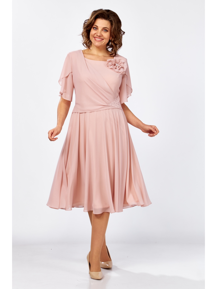 Женское платье полу-прилегающего силуэта, выполнено из шифона, на трикотажной подкладке. Лиф платья отрезной по линии талии, горловина округлой формы, на обтачке, также на лифе обработана ассиметричная, отлетная деталь со складками с одной стороны, которая уходит в боковой шов и декорирована стразами. Юбка расклешенная, выполнена из шифона, спинка со средним швом и рельефами, в среднем шве потайная молния. Рукав втачной, из шифона, расклешенный, укороченный.