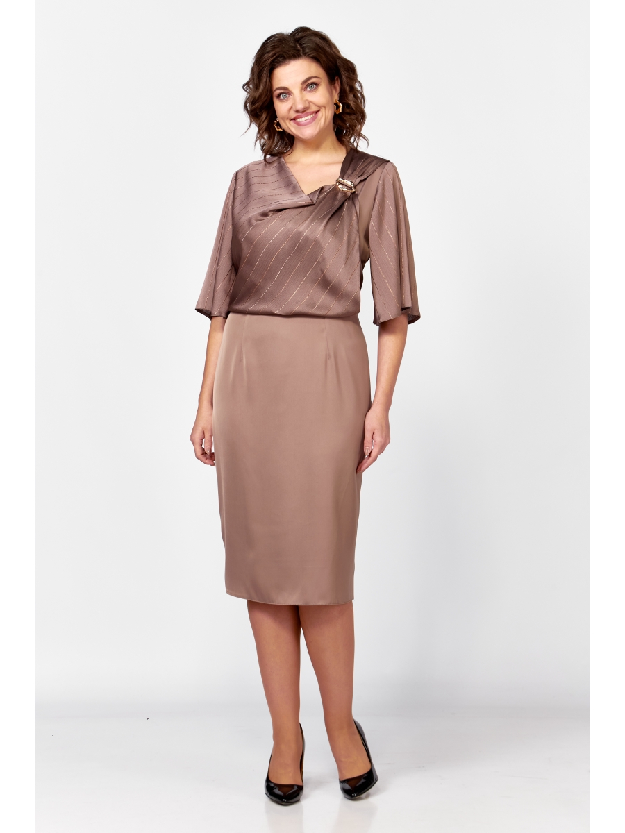Женское платье полу-прилегающего силуэта, выполнено из однотонного атласа и атласа в полоску. Лиф платья двойной и отрезной по линии талии, горловина нижнего слоя лифа округлой формы, второй слой лифа на полочке выполнен из атласа в полоску и по горловине задрапирован на эффектную пряжку. Юбка платья заужена к низу, с вытачками, выполнена из однотонного атласа. Спинка платья из однотонного атласа, со средним швом и вытачками, в среднем шве потайная молния, по низу разрез. Рукав укороченный, втачной, из атласа в полоску.