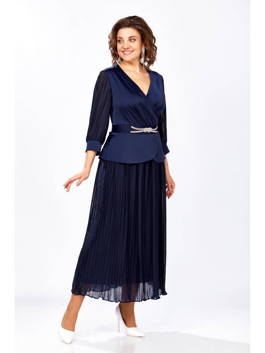 Нарядное женское платье, полу-прилегающего силуэта, выполнено из атласа и плиссированной ткани. Лиф платья выполнен из атласа, отрезной по линии талии, с втачным поясом, пояс декорирован элементом из страз. Горловина V-образной формы, на обтачке, лиф платья с имитацией запаха, по линии талии заложены складки. Юбка платья выполнена из плиссированной ткани, также на юбке от линии пояса обработан отлетная баска из атласа. Спинка идентична полочке, отрезная по линии талии, со средним швом и вытачками, в среднем шве потайная молния. Рукав втачной, выполнен из плиссированной ткани, по низу присборен на манжет.