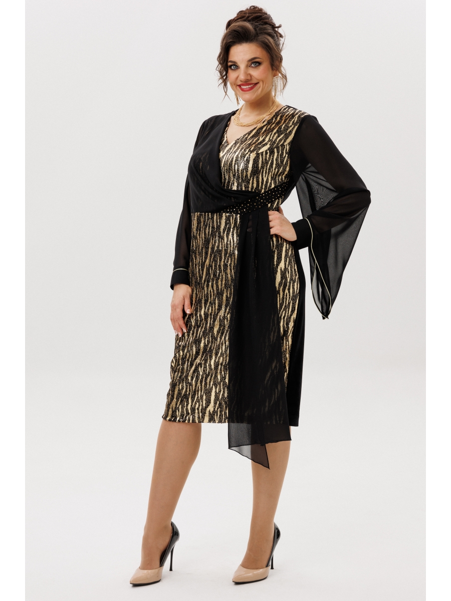 Элегантное женское платье полу-прилегающего силуэта, выполнено из трикотажного полотна, велюра и шифона. Горловина платья V-образная, обтачена подкладкой, по линии талии отрезное с вставкой из велюра по одной стороне и декорирована стразами. На лифе выполнена отлетная деталь из шифона по одной стороне, которая плавно переходит в отлетной шлейф на юбке. Спинка платья выполнена из однотонного велюра, со средним швом и вытачками, полочка на трикотажной подкладке. Рукав втачной, длинный, выполнен из шифона, расклишается к низу. Низ рукава декорирован кантом и притачной манжетой из шифона, с застежкой на петлю-пуговицу.