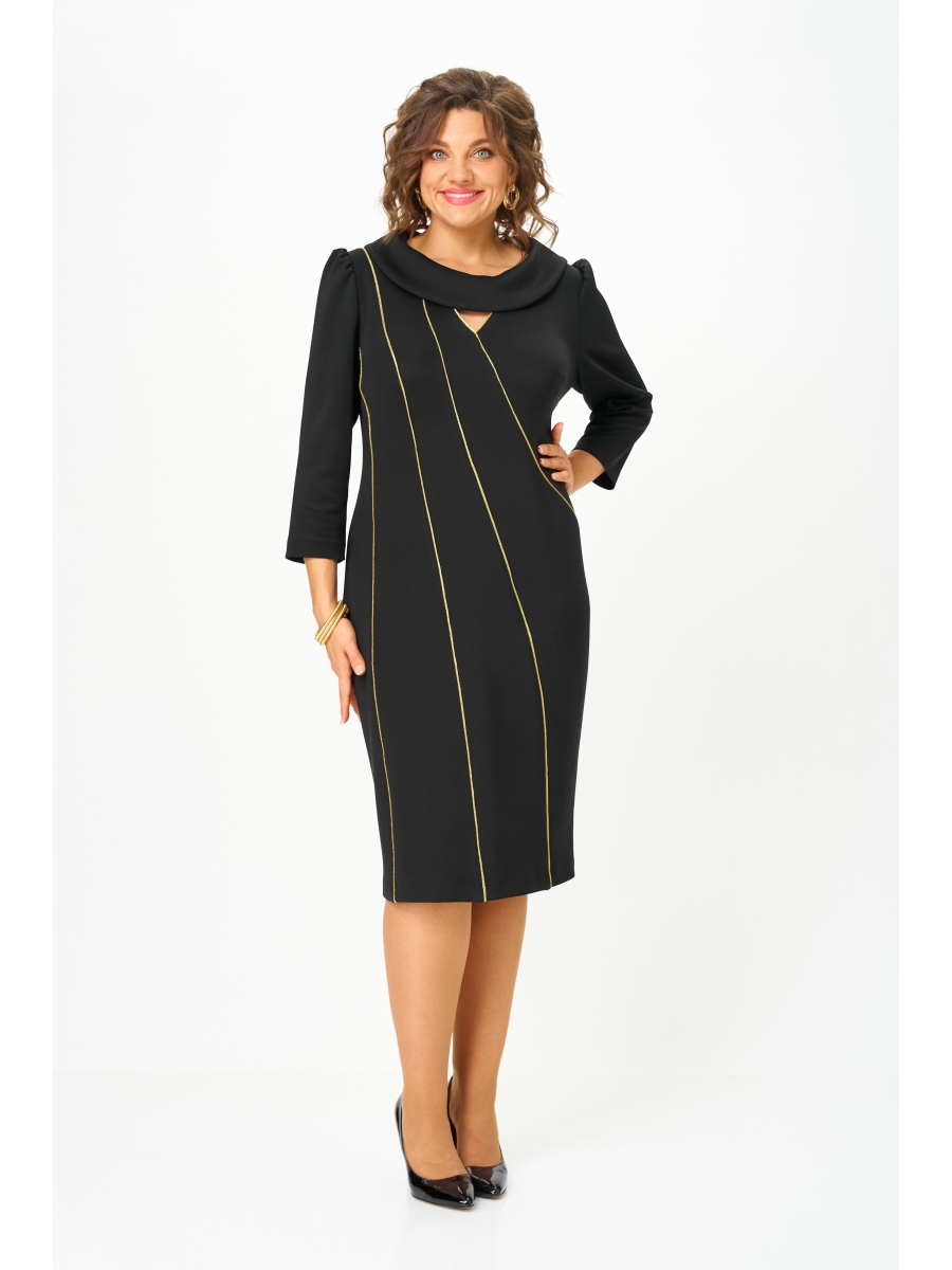 Элегантное женское платье полу-прилегающего силуэта, выполнено из трикотажного полотна, хорошо тянется. Горловина платья обработана воротником-шалью, также на лифе по центру обработан фигурный вырез с отделкой кантом. На полочке обработаны ассиметричные подрезы с кантом. Рукав втачной, оптимальной длины, по окату сборка. Спинка со средним швом и вытачками, в среднем шве потайная молния.