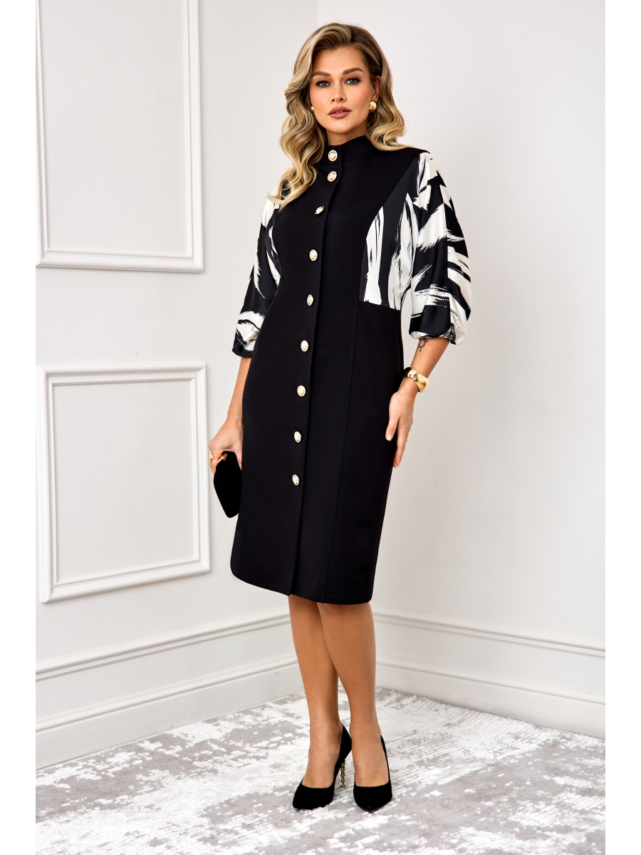 Стильное женское платье, выполнено из высококачественного трикотажа, рукава платья выполнены из атласной ткани с модным дизайнерским принтом, в стиле летучая мышь, по низу рукав на резинке. Платье с застежкой по переду на пуговицы, с горловиной стойкой, что придает модели особый стиль и шарм.