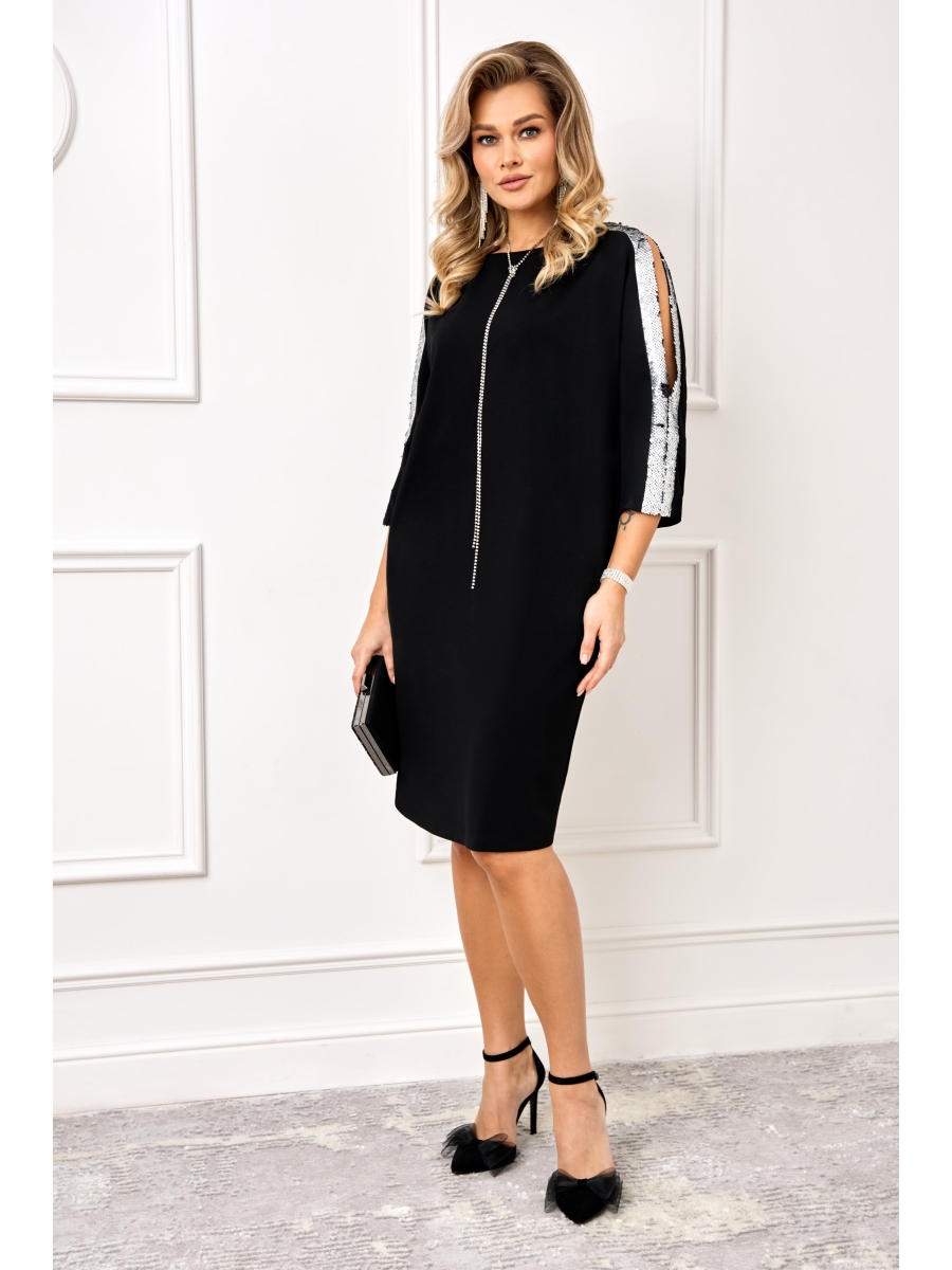 Стильное женское платье, выполнено из высококачественной ткани Креп на трикотажной основе (ткань мягкая, приятная к телу, хорошо тянется). Платье прямого силуэта, без подкладки, в боковых швах функциональные карманы. Рукава летучая мышь, с разрезом и отделкой из переворачивающихся пайеток, которые меняют цвет с черного на серебро, что придают платью особый шарм и нарядность.