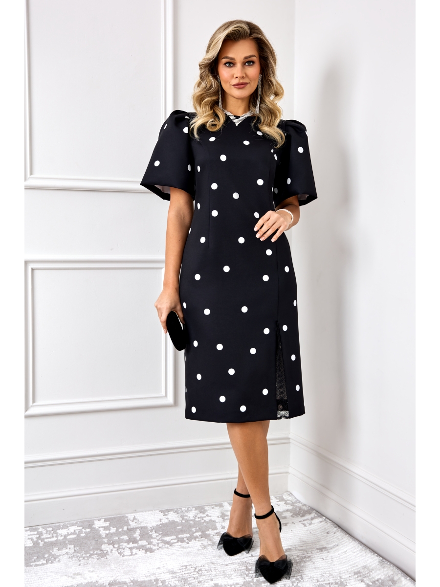 Роскошное нарядное платье, выполнено из плательной ткани Барби с добавлением вискозы с модным принтом горох. Платье с объемными рукава, что придает модели особый стиль и шарм. Платье прилегающего силуэта, вырез горловины округлый, по переду с разрезом и декорировано кружевом. По спинке платья потайная молния застежка.