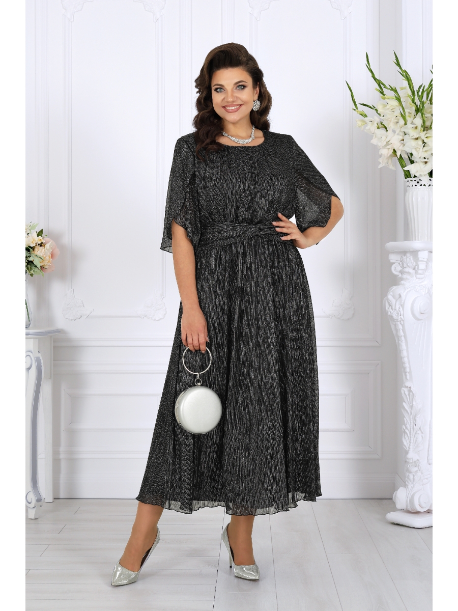 Платье женское, приталенного силуэта, выполнено из сетки-гофре с нитью «люрекс». Модель на трикотажной подкладке, без застежки и плечевых накладок. Платье отрезное по линии талии, с полуприлегающим лифом и расширенной к низу юбкой; для лучшего прилегания в области талии на внутренний шов настрочена узкая эластичная лента. Перед дополнен задрапированным поясом с перекрутом, концы которого входят в боковые швы. По плечевым швам, горловине и подрезу талии – сборка. Горловина округлая, окантована узкой косой бейкой из основного материала. Рукав короткий, расширенный, с фигурным низом, переходящим в разрез, края которого по окату скреплены на запах. Длина платья (от горловины спинки) – 131 см, длина платья (от талии спинки) – 92 см; длина рукава – 30 см.