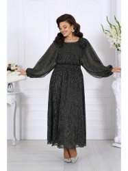 Платье женское, приталенного силуэта, выполнено из сетки-гофре с нитью «люрекс». Модель на трикотажной подкладке, без застежки и плечевых накладок. Платье отрезное по линии талии, со свободным лифом и расширенной к низу юбкой. Для лучшего прилегания в области талии в отрезном поясе предусмотрена эластичная лента, вставленная по всей длине. Лиф цельнокроеный с рукавами, без боковых швов -- с разрезами от талии до манжет. Для регулирования длины рукава внутрь манжеты протянута эластичная лента. Горловина округлая, окантована узкой косой бейкой из основного материала. Платье дополнено съемным «цветком» з основного полотна. Длина платья (от горловины спинки) – 139 см, длина платья (от талии спинки) – 97 см; длина рукава (от горловины до манжеты) – 70 см (50-52 р-р), 71 см (54-58 р-р).