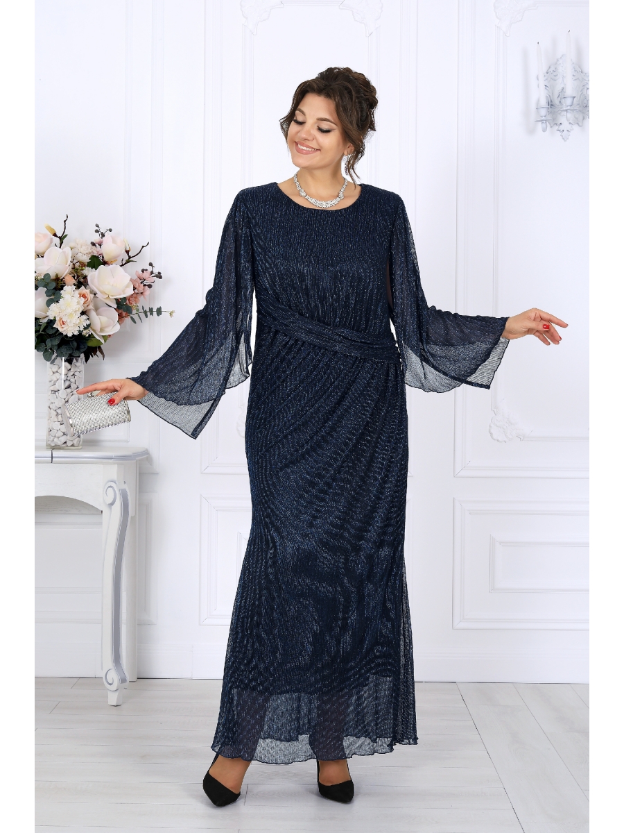 Платье женское, прилегающего силуэта с расширением к низу, выполнено из сетки-гофре с нитью «люрекс». Модель на трикотажной подкладке, без застежки, с плечевыми накладками. В верхней части переда косой подрез со сборкой; в шов подреза входит задрапированный декоративный элемент. На спинке обработаны талиевые вытачки. Вырез горловины переда и спинки округлой формы, по переду углубленный. Рукав без шва, с отлетными краями и фигурным низом, по окату сборка; крепится к пройме только в верхней части. Пройма окантована узкой косой бейкой из основного материала Длина платья – 140 см; длина рукава – 54 см.