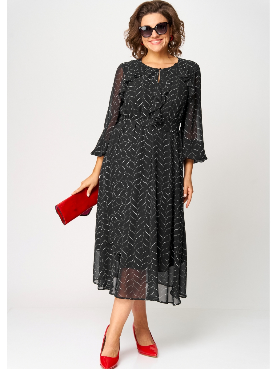 Платье женское нарядно-повседневное на трикотажной подкалке полуприлегающего силуэта расширенное к низу. Выполнено из шифона с принтом. Вырез горловины круглый на обтаке по центру на застежке на навесную петлю и пуговицу. Рукав втачной по низу собран на резинку. Декором служат рюши по лифу из основной ткани и съемный пояс. Платье можно носить с поясом и без него.