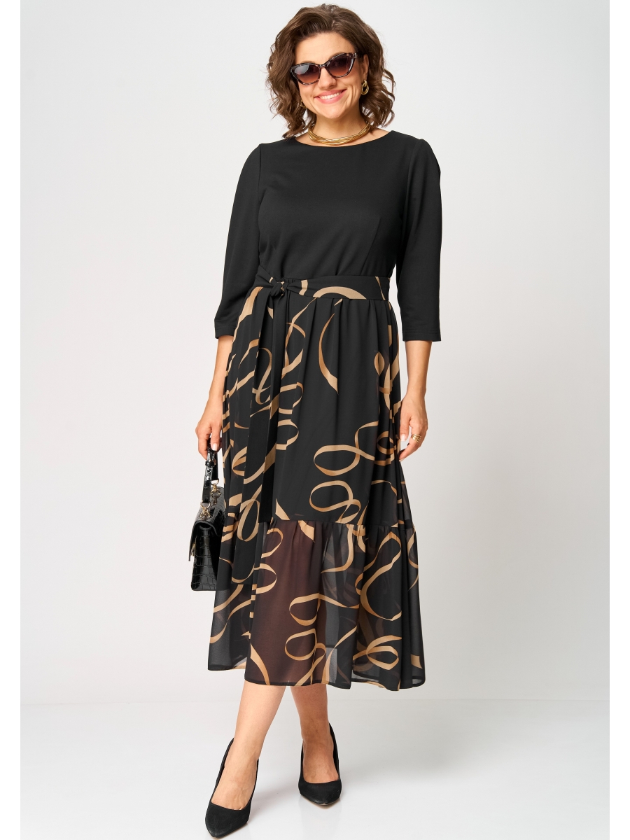 Платье женское нарядно-повседневное полуприлегающего силуэта до талии. Выполнено из трикотажного полотна в сочетании с шифоном. Вырез горловины круглый на обтачке. По спинке застежка капелька на навесную петлю и пуговицу. Рукав втачной 7/8 по верху со встречной складкой. Платье отрезное по талии, верх из трикотажного полотна , низ платья юбка со сборкой.