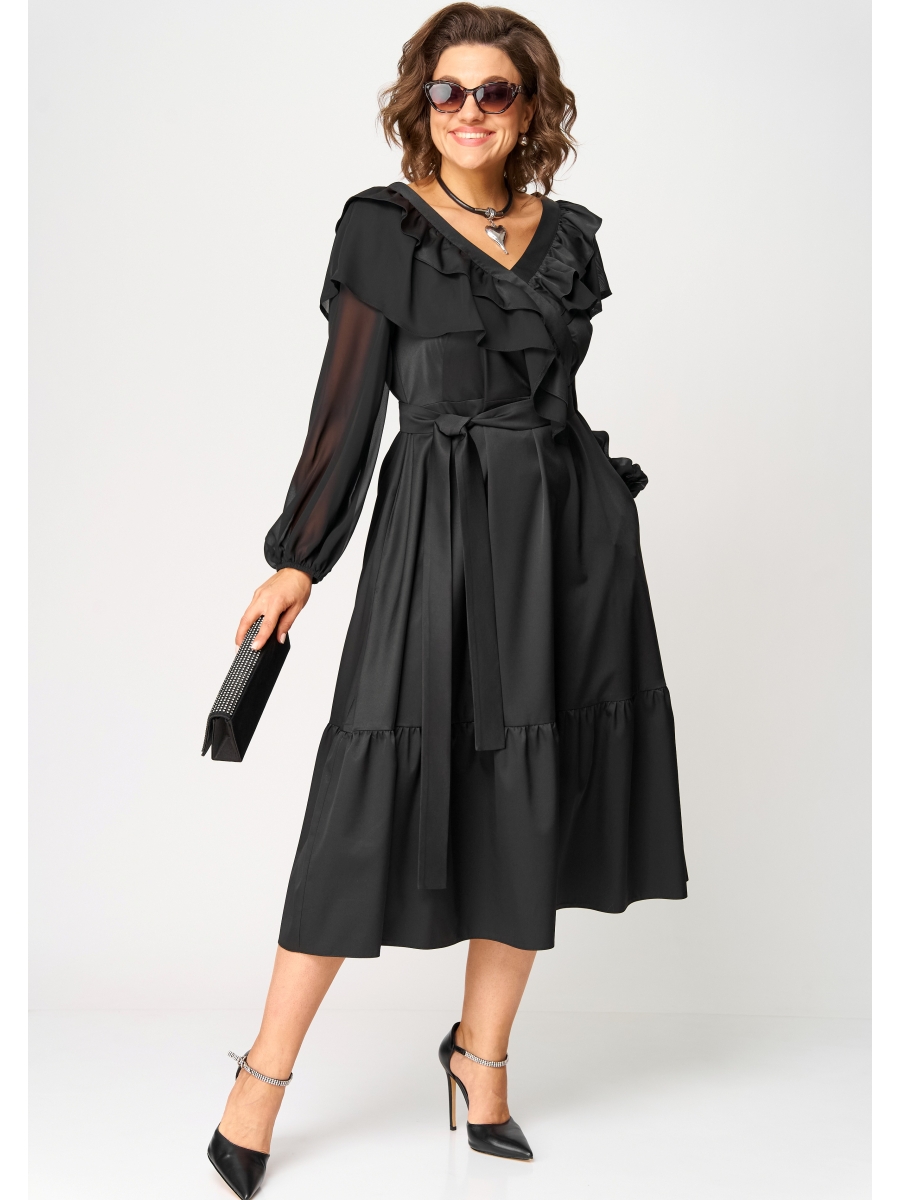 Платье женское нарядно-повседневное полуприлегающего силуэта до талии и расширенное к низу. Платье отрезное по линии талии, вырез горловины V-образный с ассиметричными рюшами из тканей двух дизайнов. Рукав втачной из шифона по низу на резинке. В боковых швах платья обработаны карманы, по низу притачной волан из основной ткани.