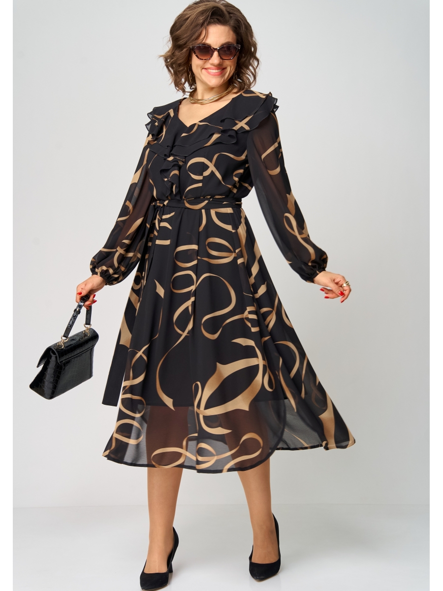 Платье женское нарядно-повседневное полуприлегающего силэта до талии расширенное к низу. Платье отрезное по талии на трикотажной подкладке, выполнено из креп-шифона. Вырез горловины V-образный обработан обтачкой, по горловине полочки и спинки двойные воланы. Рукав втачной по низу на резинке. По юбке небольшие складки. В боковых швах обработаны разрезы, низ фигурный.