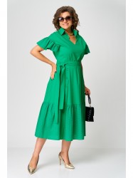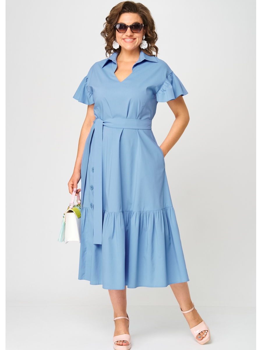 Платье женское нарядно-повседневное полуприлегающего силуэта расширенное к низу. Выполнено из хлопка. Вырез горловины фигурный, воротник на стойке с фигурным вырезом. Рукав спущенный из отделочной ткани по низу с воланом собранным на сборку. Платье отрезное по линии талии. Юбка ассиметричная с застежкой доверху на обметанные петли и пуговицы в боковых швах обработаны карманы. По низу юбки притачной волан из основной ткани.