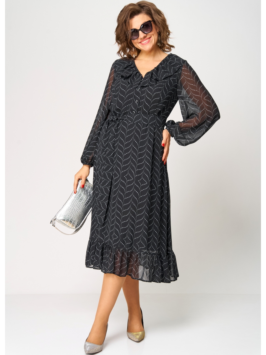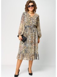 Платье женское нарядно-повседневное полуприлегающего силуэта расширенное к низу на трикотажной подкладке. Выполнено из креп-шифон с анималистичным принтом. Платье отрезное по талии, по низу юбки волан со сборкой. Вырез горловины V-образный с притачной рюшей, обработан обтачкой. Рукав втачной по низу на резинке.