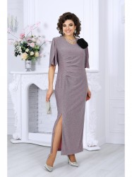 Платье женское полуприлегающего силуэта, выполнено из трикотажного полотна с фактурной лицевой стороной «люрекс». Модель на трикотажной подкладке, с плечевыми накладками. В левом боковом шве расположена застежка на потайную тесьму-«молнию» (35 см). Перед платья со смещенным к боковому шву рельефом, идущим от проймы до низа; в нижней части рельефа обработан разрез. Левая часть переда отрезная по линии талии, с односторонними горизонтальными складками, направленными от рельефа к центру. Спинка с талиевыми вытачками. Горловина спинки округлая, по переду V-образная, углубленная. Рукав короткий, втачной, формы «крылышко на запах», со скругленными срезами. Платье дополнено съемным «цветком» из основного полотна. Длина платья - 136 см; длина рукава - 34 см.