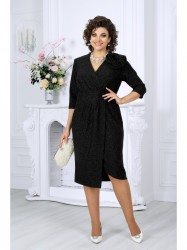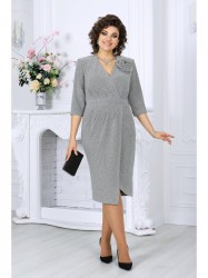 Платье женское полуприлегающего силуэта, выполнено из трикотажного полотна с фактурной лицевой стороной «люрекс». Модель на трикотажной подкладке, с плечевыми накладками. На правой части переда, вдоль отрезного пояса, заложены косые односторонние складки; детали лифа и юбки скреплены на запах. Низ платья асимметричный: правая часть переда удлинена к центру и оформлена углом, левая -- скругленная и входит в правый боковой шов. На спинке обработаны талиевые вытачки. В левом боковом шве предусмотрена застежка на потайную тесьму-«молнию» (35 см). Рукав длиной 3/4, втачной. Платье дополнено съемным «цветком» из основного полотна. Длина платья-108 см; длина рукава-41 см.