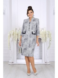 Платье женское, полуприлегающего силуэта, выполнено из жаккардового трикотажного полотна с напылением. Модель на трикотажной подкладке, с плечевыми накладками. Перед отрезной по линии талии: на верхней части обработаны рельефы, направленные от пройм, V-образный вырез и средний шов, декорированный пуговицами; на нижней части обработаны талиевые вытачки и настрочены клапаны с бейками по краю и пуговицами по центру. Спинка отрезная по линии талии; на верхней части обработаны рельефы, направленные от пройм, на нижней – талиевые вытачки и средний шов со шлицей. Горловина оформлена стойкой с закругленными концами. Застежка на потайную тесьму молнию расположена в среднем шве спинки и переходит на стойку. Рукав втачной, трехчетвертной. Бейки клапанов и обтяжные пуговицы выполнены из отделочного трикотажного полотна. Длина платья – 106 см; длина рукава – 45 см.
