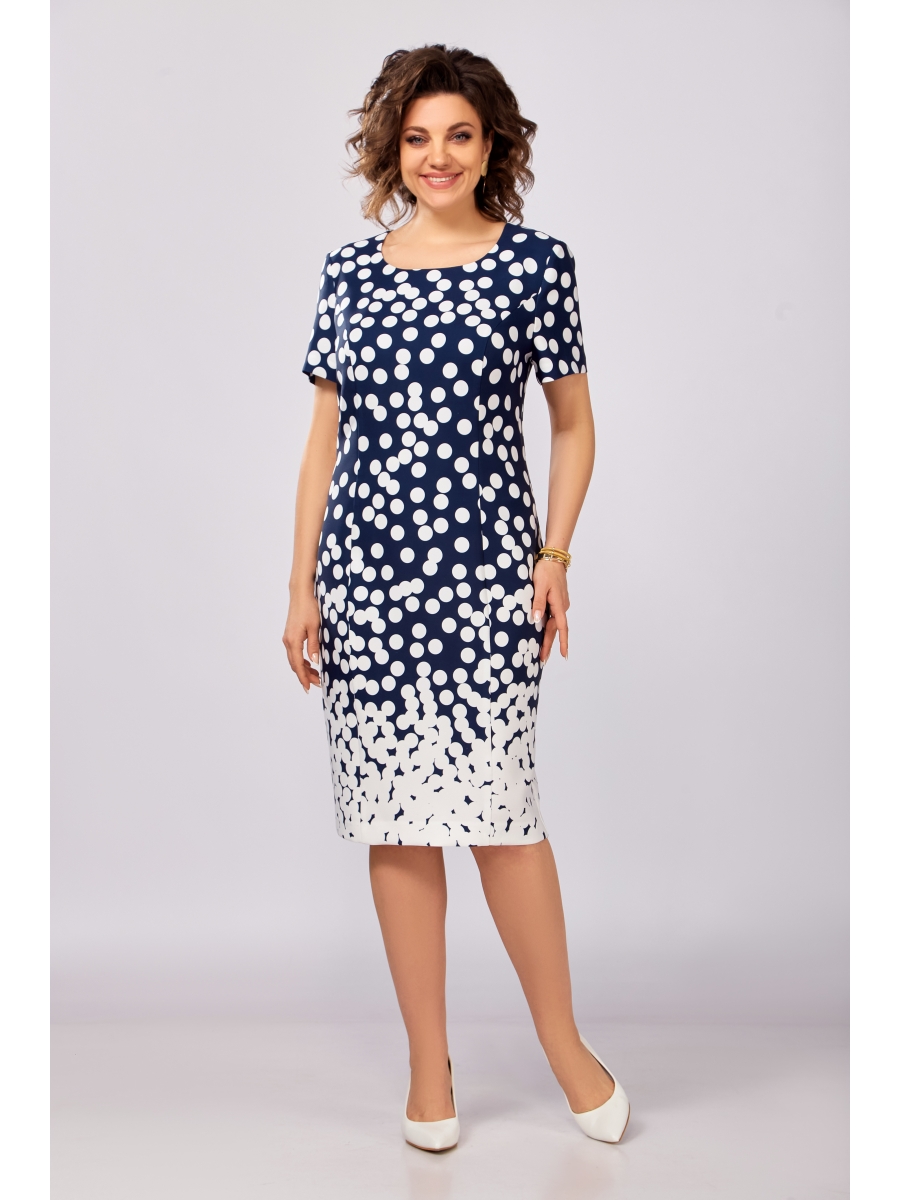 Платье полуприлегающего силуэта из мягкой поливискозной ткани с оригинальным дизайнерским принтом. По полочке выполнены рельефные швы, по спинке рельефные швы, средний шов со шлицей и застёжкой на потайную тесьму-молнию. Горловина круглая, обработана обтачкой. Рукав втачной, короткий.