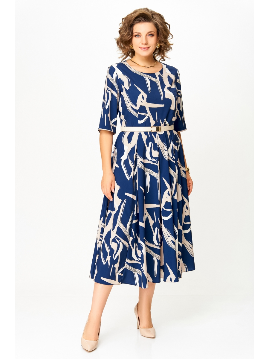 Платье из мягкой струящейся вискозной ткани Х-образного силуэта с полуприлегающим лифом. Платье отрезное по линии талии. По переду лифа расположены рельефы, по спинке лифа - талиевые выточки. Юбка расклешенная из шести клиньев со встречными складками по линии талии. В среднем шве спинки предусмотрена молния. Рукав втачной длиной 3/4.