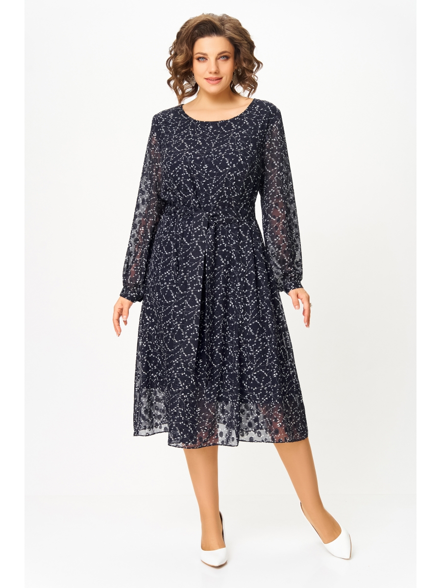 Платье полуприлегающего силуэта из фактурной шифоновой ткани с тиснёным узором на трикотажной подкладке. Полочка с отрезными рельефами, спинка с центральным швом и рельефами. Горловина округлой формы. Рукав втачной, длинный внизу со сборкой и манжетой, которая застёгивается на петлю и пуговицу.