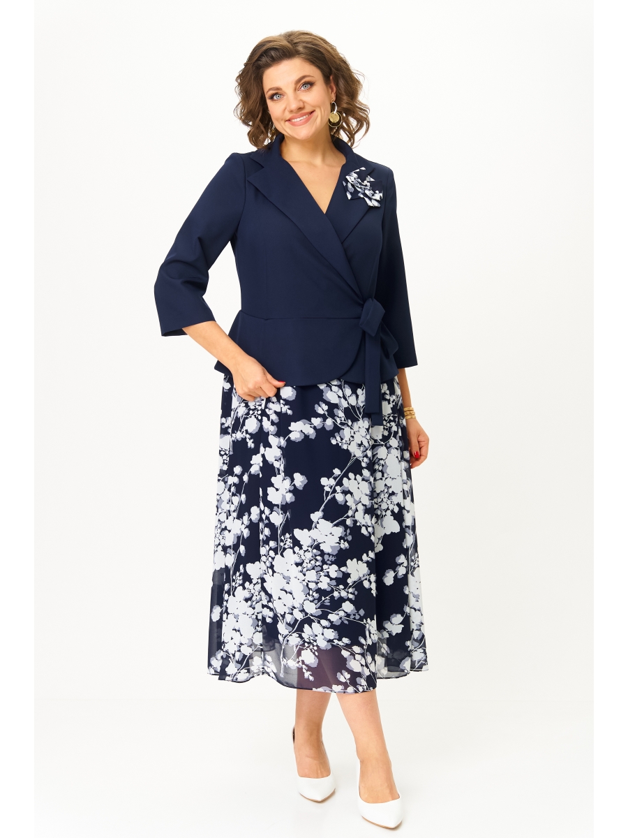 Элегантное женское платье, выполнено в виде имитации костюма из двух видов ткани. Лиф из плательной ткани, юбка из шифона. Платье с запахом, горловина с воротником пиджачного типа с отложными лацканами. Рукава втачные, длина 3/4.