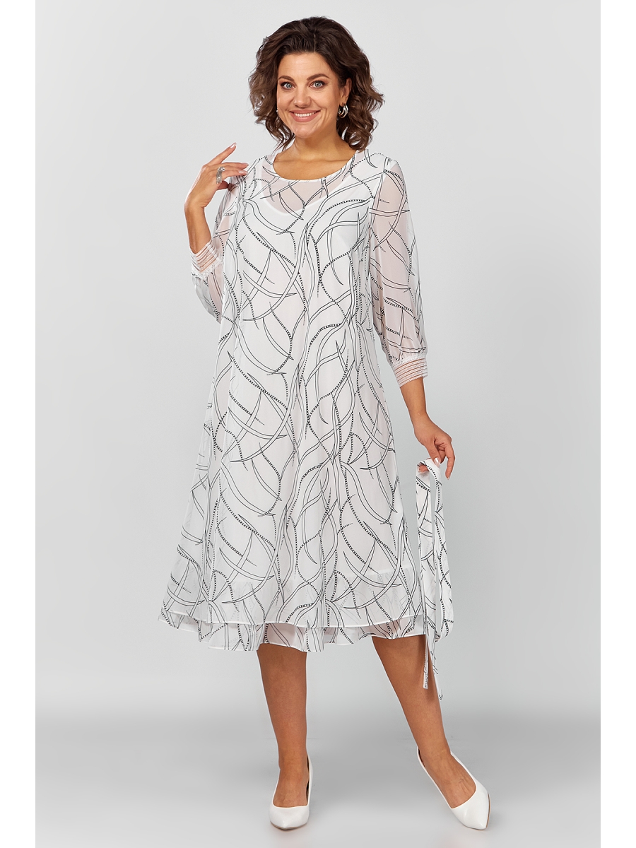 Элегантное платье из шифоновой ткани с оригинальным абстрактным принтом. Горловина овальной формы, нагрудные вытачки направлены от бокового шва к центру груди, спинка со средним швом и каплевидной застежкой на пуговице. Низ платья обрамляет волан, наполняя образ воздушной многослойностью. Рукав втачной, одношовный, низ рукава собран на эластичную декоративную тесьму. Платье на трикотажной подкладке. Нарядное платье, в котором Вы будете выглядеть женственно и романтично. К платью прилагается съемный пояс.
