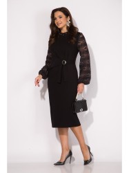 Эта модель платья из мягкого, уютного трикотажа подходит как для повседневного использования, так и для торжественных мероприятий. Прочная и эластичная ткань делает его незаменимым элементом вашего гардероба. Облегающий силуэт с эффектным подрезом по линии талии, переходящий в пояс с металлической пряжкой акцентирует фигуру и создает стильный, утончённый вид. Мягкая полулежащая стойка у горловины украшена пробивными бусинами из жемчуга. Спинка с центральным швом и обработанной шлицей по низу изделия. Застежка – потайная тесьма-молния по спинке.
