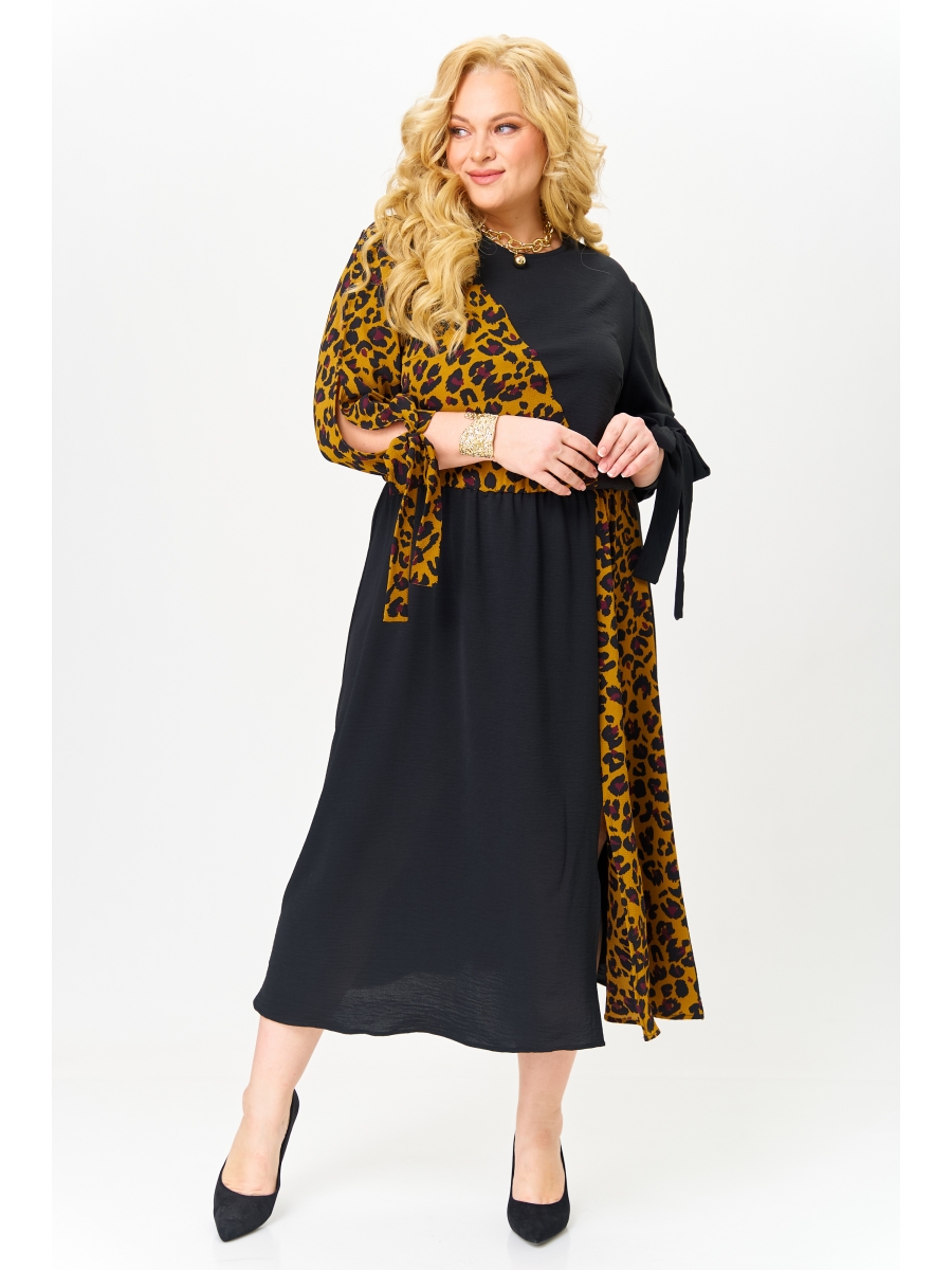 Элегантное нарядное платье с ассиметричным решением кроя сядет на любую фигуру и подчеркнет индивидуальность и женственность. Простые линии придадут изысканность и лаконичность. Перед платья с отрезным лифом и нижней частью. Юбка платья с кокетливым разрезом. Полочка и низ платья выполнены из контрастных тканей. Круглая горловина. Рукав ¾ с разрезами, с завязками на манжете. Такое платье достойно станет базовым элементом дамского гардероба. Наряд можно носить и в офис, и на прогулку, и в ресторан или встречу с друзьями. Благодаря легкой стрейчевой ткани сядет на любую фигуру. Длина платья универсальная, поэтому его могут носить девушки и дамы любого возраста.