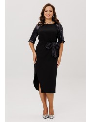 Нарядное женское платье, выполненное из двух видов ткани: плательно-костюмной (тянется ) и плательной с пайетками (тянется). Платье полуприлегающего силуэта, покроя «Реглан». По переду ассиметричный подрез, переходящий в рельеф. Рельеф переходит в талиевую вытачку. По спинке средний шов, потайная застежка-молния и талиевые вытачки. Низ переда и спинки фигурной формы с разрезом по переду. Горловина округлой формы. Рукава-реглан со швом по середине и на подкладке. Само платье без подкладки.