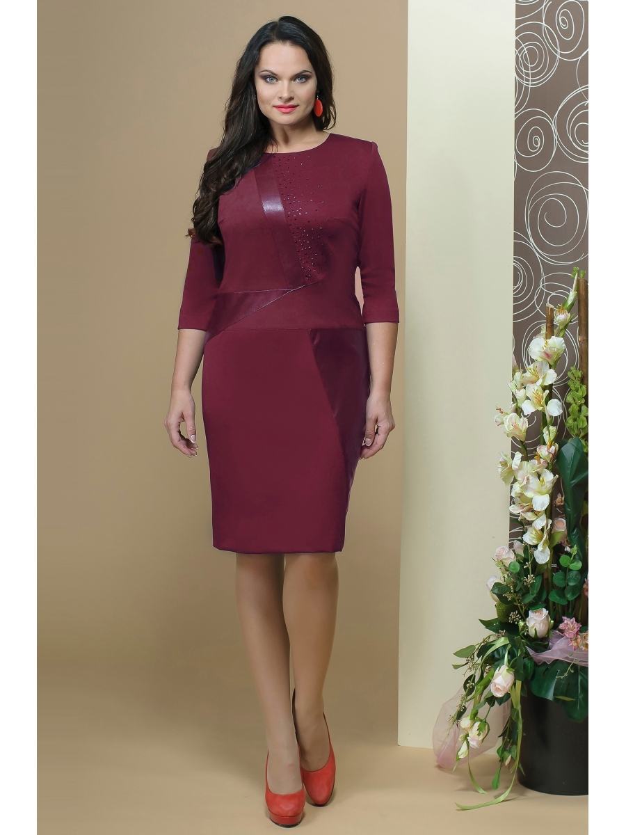 Нарядное платье полуприталенного силуэта. По переду выполнено со вставками из экокожи, замши, и декорировано стразами. Спинка со средним швом, переходящим в шлицу, с талиевыми вытачками. Застёжка - скрытая молния по центру спинки. Горловина округлая. Рукав 3/4.