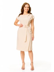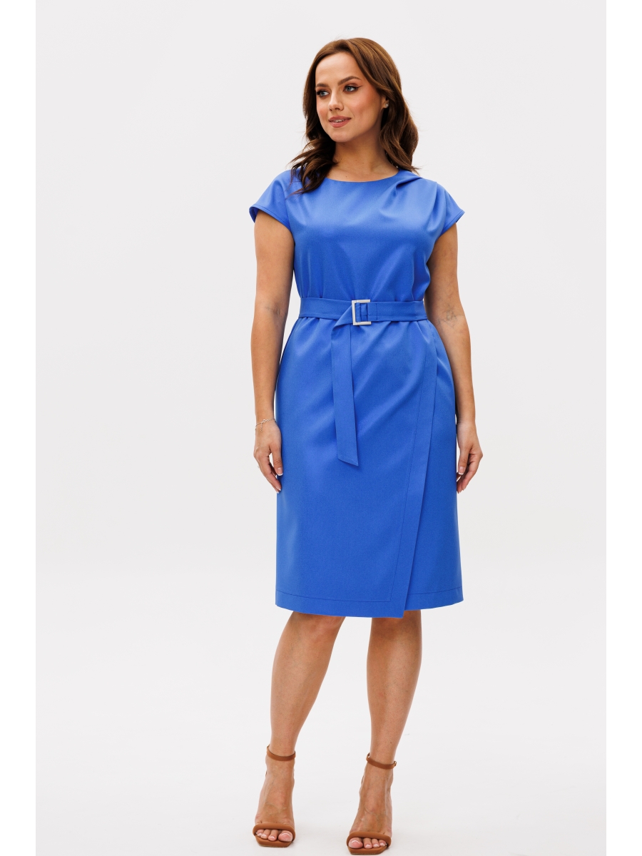 Платье нарядное из плотной плательной ткани с блеском. Полуприлегающего силуэта, перед с глубоким запахом. По левому плечу складки. Застежка молния по спинке. Горловина овальная. Плечо спущено. Пояс с пряжкой.