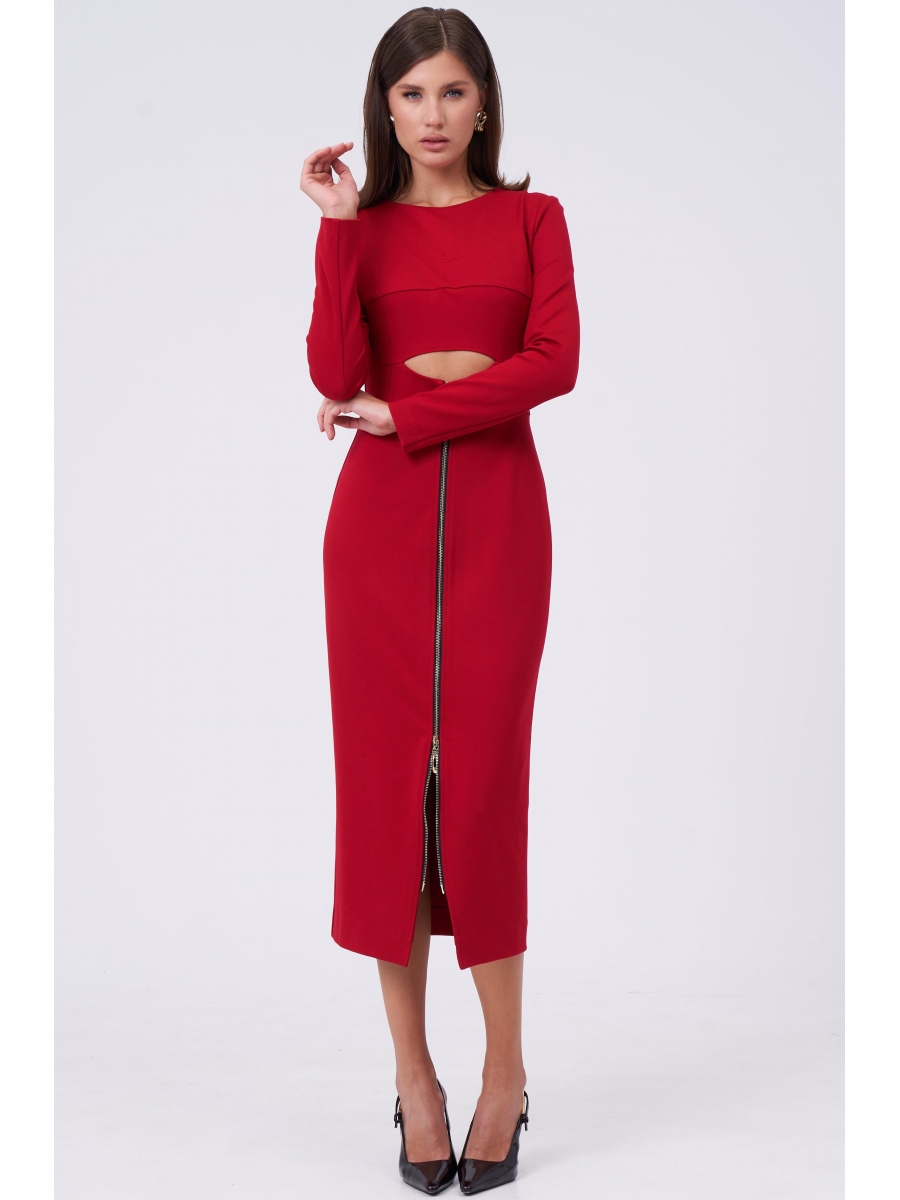 Платье прилегающего силуэта из плотного трикотажного полотна. Небольшой вырез под грудью создаёт эффект топа с юбкой с завышенной талией. Металлическая молния по переду даёт возможность регулировать длину разреза. Застёжка на потайную молнию по спинке.