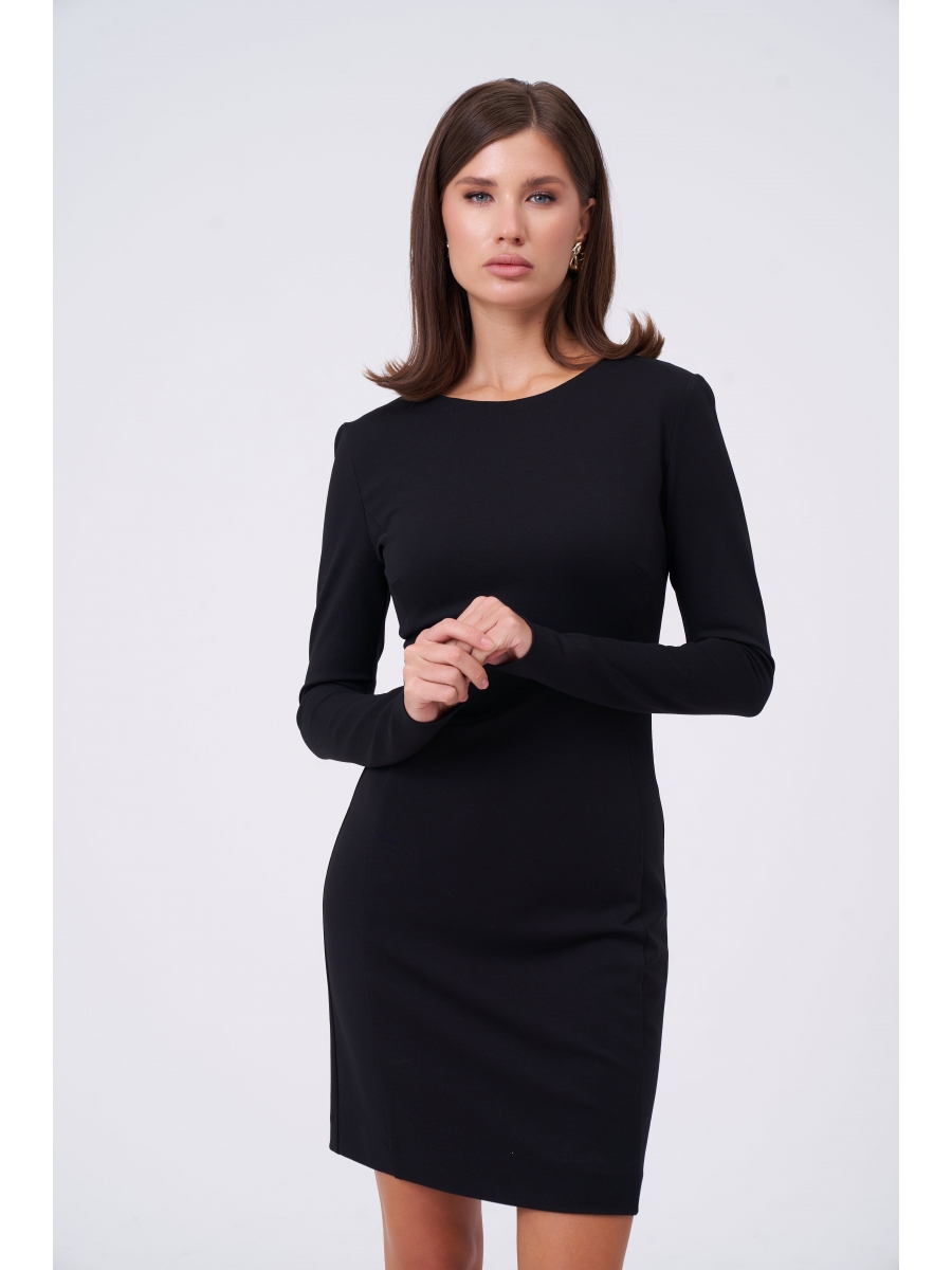 Прилегающее платье из трикотажного полотна. Рукав полноценной длины. По переду платье выглядит базовым, но весь акцент и изюминка на спине в виде глубоко выреза и контрастной шнуровки. Застёжка на потайную молнию сбоку. Сзади шлица.