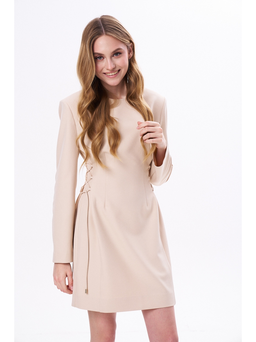 Приталенное платье длиной мини с длинным рукавом и расширенной линией плеча за счёт плечевых накладок. По бокам шнуровка позволяющая регулировать прилегание. Застёжка на потайную молнию сзади.