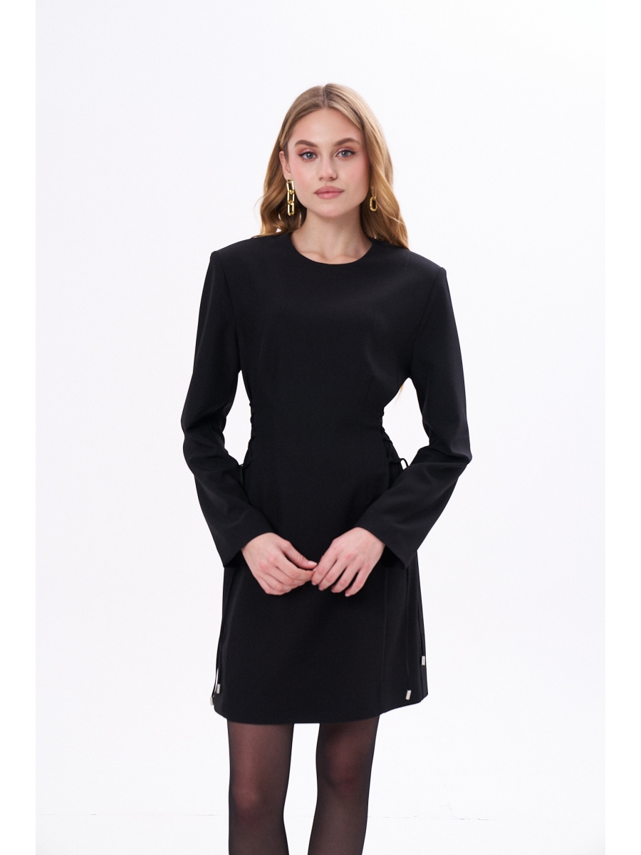 Приталенное платье длиной мини с длинным рукавом и расширенной линией плеча за счёт плечевых накладок. По бокам шнуровка позволяющая регулировать прилегание. Застёжка на потайную молнию сзади.