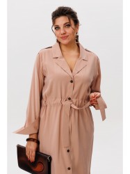 Изысканный английский воротник с лацканами придает платью благородную строгость, а центральная застёжка на пуговицы позволяет варьировать степень открытости, адаптируя наряд к разным ситуациям. Кулиска по линии талии и завязывающийся пояс дают возможность регулировать силуэт – от мягкого полуприлегающего до более выразительного, подчёркивающего талию.